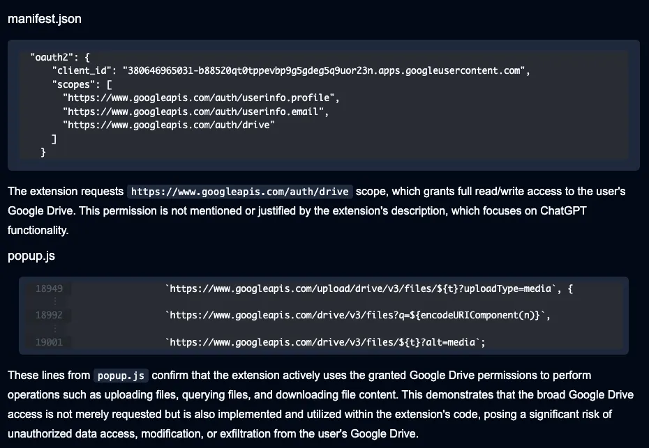 The extension also requests read/write access into Google, potentially creating pathways for unauthorized data access and exfiltration from victims’ Google Drive accounts.